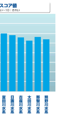 | きたない地点ランキングではあるが、一番評価の低かった左会津川の高雄大橋でも少しきたない水(β中腐水性水域)と判定されています。 |