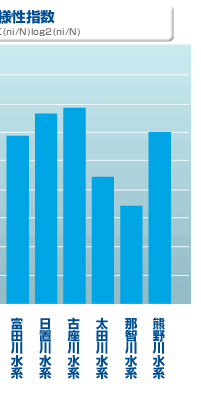 南部川、左会津川水系、太田川、那智川は、他の河川に比べ河川規模が小さいために、多様性指数が低くなる傾向にあると思われます。 |